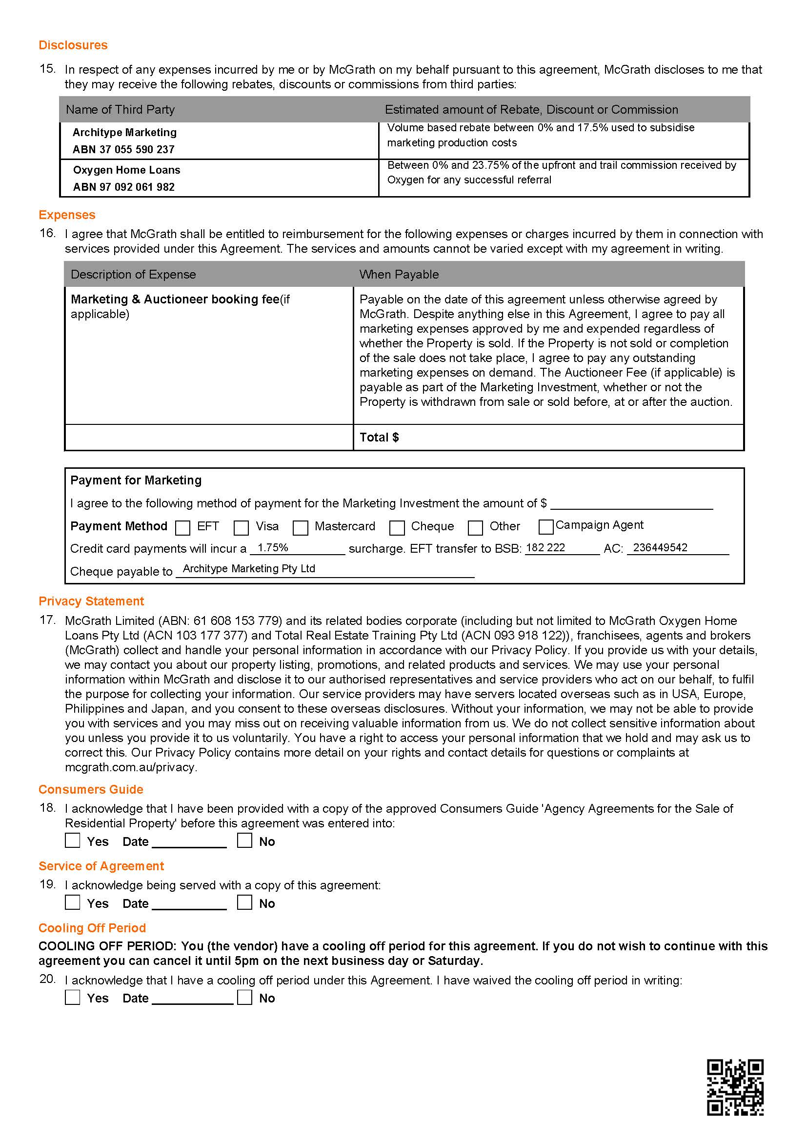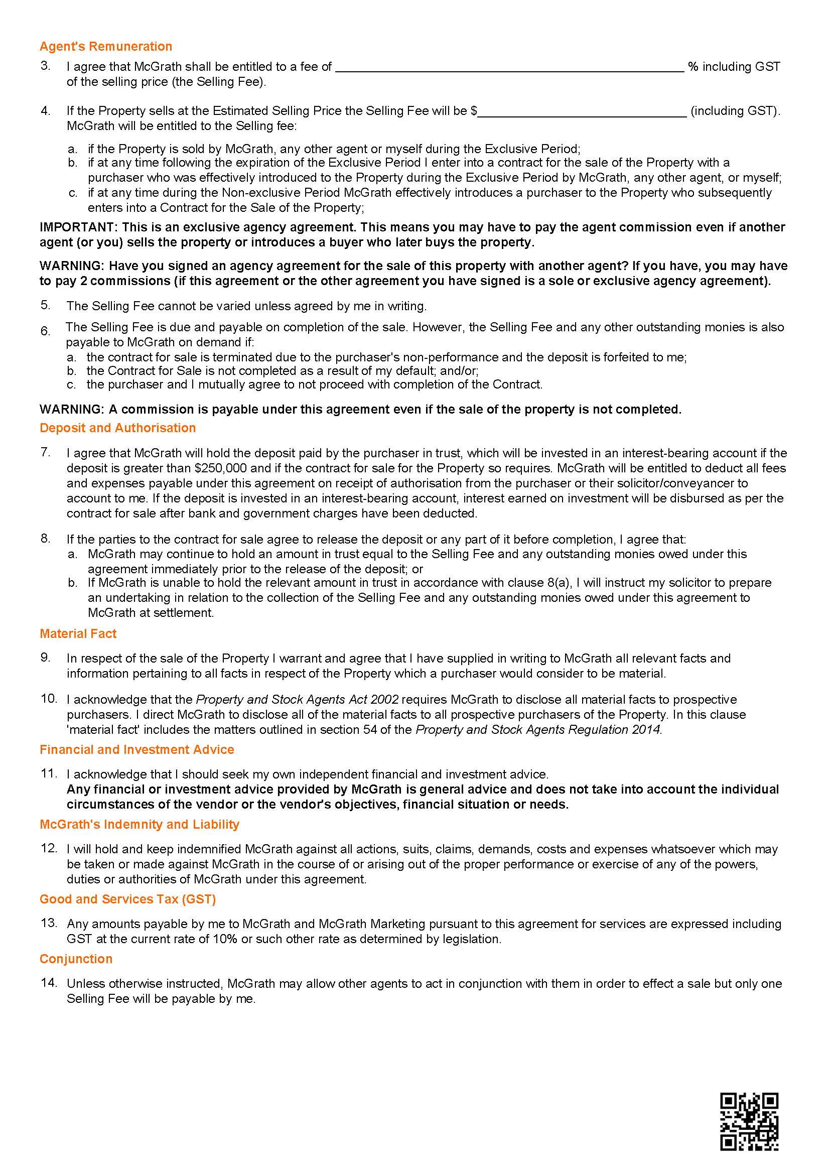 Sometimes an agency agreement will relate to the sale of either multi-lot subdivisions or a new development where there are multiple properties available of varying size and price within the development. In such cases, the agent may include an attached schedule of the lots with their individual prices, or the properties available with their features (primarily bedroom numbers) and a price for each. Any prices included in the schedule cannot be less than the estimated selling price for each unit/lot.